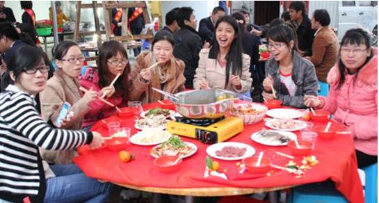 伴隨著一片片掌聲的揚(yáng)起,我們的后勤部隊(duì)把所有吃的東西都搬了上來,晚宴也在進(jìn)行中。灑桌上,熱湯的沸滾聲、同事們的嘻笑聲以及臺(tái)上正再進(jìn)行的腦筋急轉(zhuǎn)彎的節(jié)目。表情如此多樣。