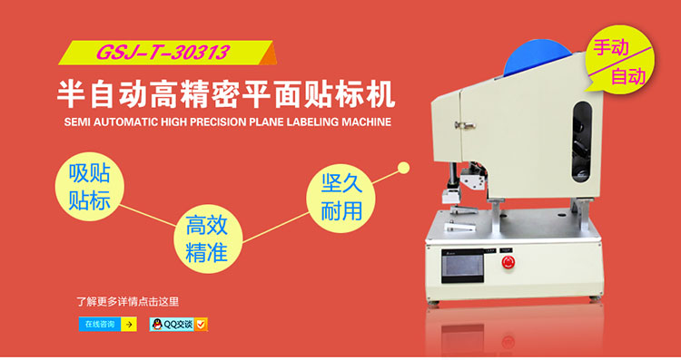 半自動高精度平面貼標機(含顯示屏),其型號為GSJ-T-30313,屬于半自動貼標機,應用吸貼方法貼標,實現在各種工件的平面上貼標,如化妝品扁瓶、包裝盒、塑料蓋貼標等。