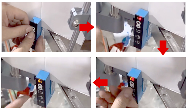 3)在燈閃紅光的過程中,用手拉動標(biāo)簽,讓兩個標(biāo)簽中間接縫的空白在電眼卡槽中間位置;一只手固定標(biāo)簽,另一只手按一下負(fù)號鍵,燈變黃色,放開手;出標(biāo)電眼設(shè)置完成。